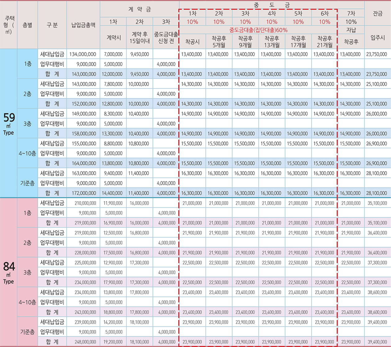 - 업무대행비(세대당 900만원) → ① 계약금 (계약시 1차 계약금 5% + 500만원), ② 1차 중도금 (착공시 1차 중도금 10% + 400만원)